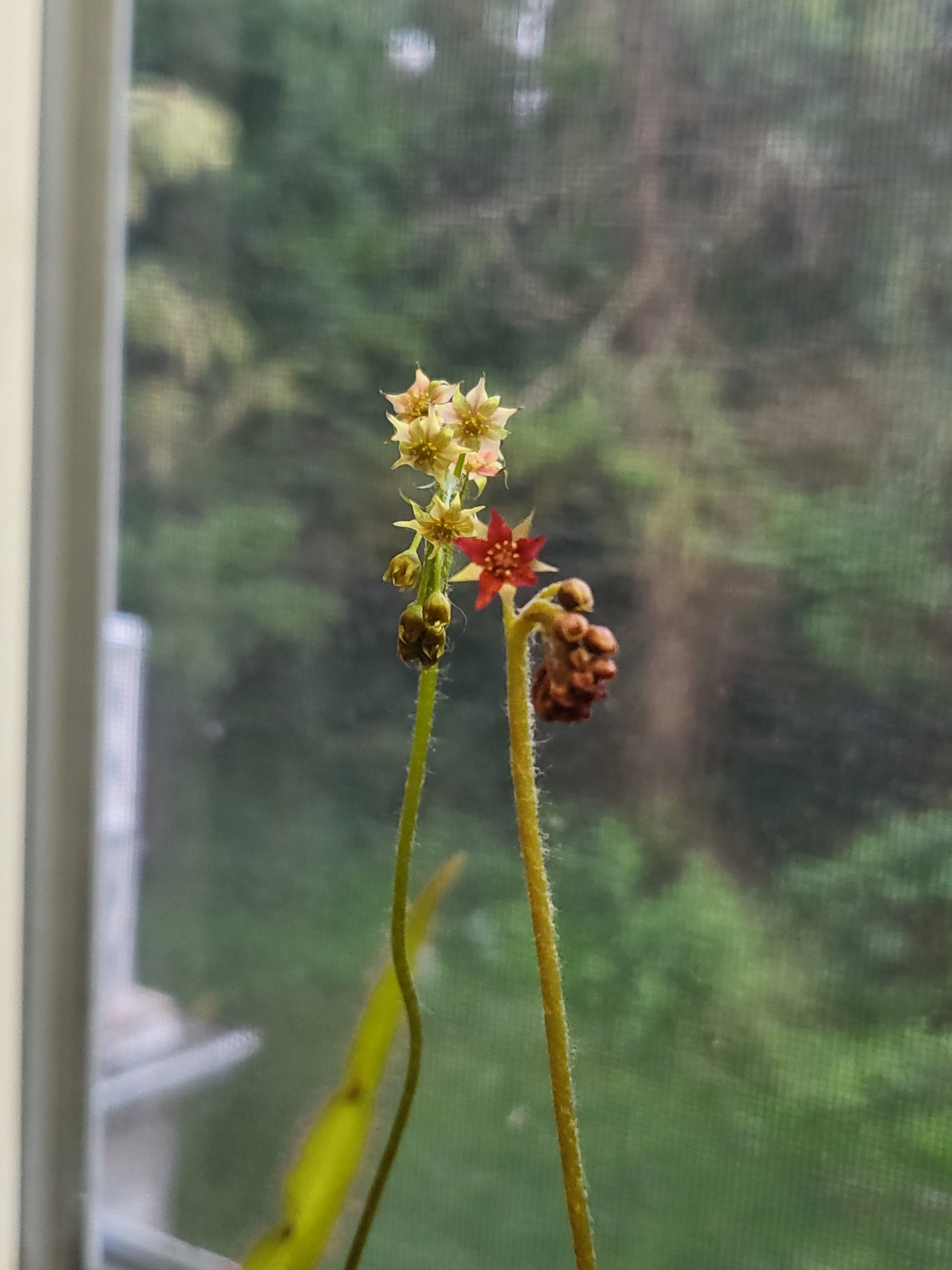 GENERAL INFO: An absolute wonder of a specimen, Drosera Adelae is an extremely hardy and magnificent species of sundew. Adelae can be found growing in water-logged grottos and the edges of rivers and streams in its hot, yet shaded climate in Queensland Australia. (The only place in the world this species is found in nature at the time of writing). In cultivation, this plant has proven to be one of the most reliable species of carnivorous plants due to it’s extreme hardiness, versatility and speed of growth. Expect very fast growth of the mother plant, complete with year-long displays of tiny, cascading Chinese firework shaped flowers and many tiny plantlets to sprout rapidly. (see cultivation requirements section for details on plantlets)