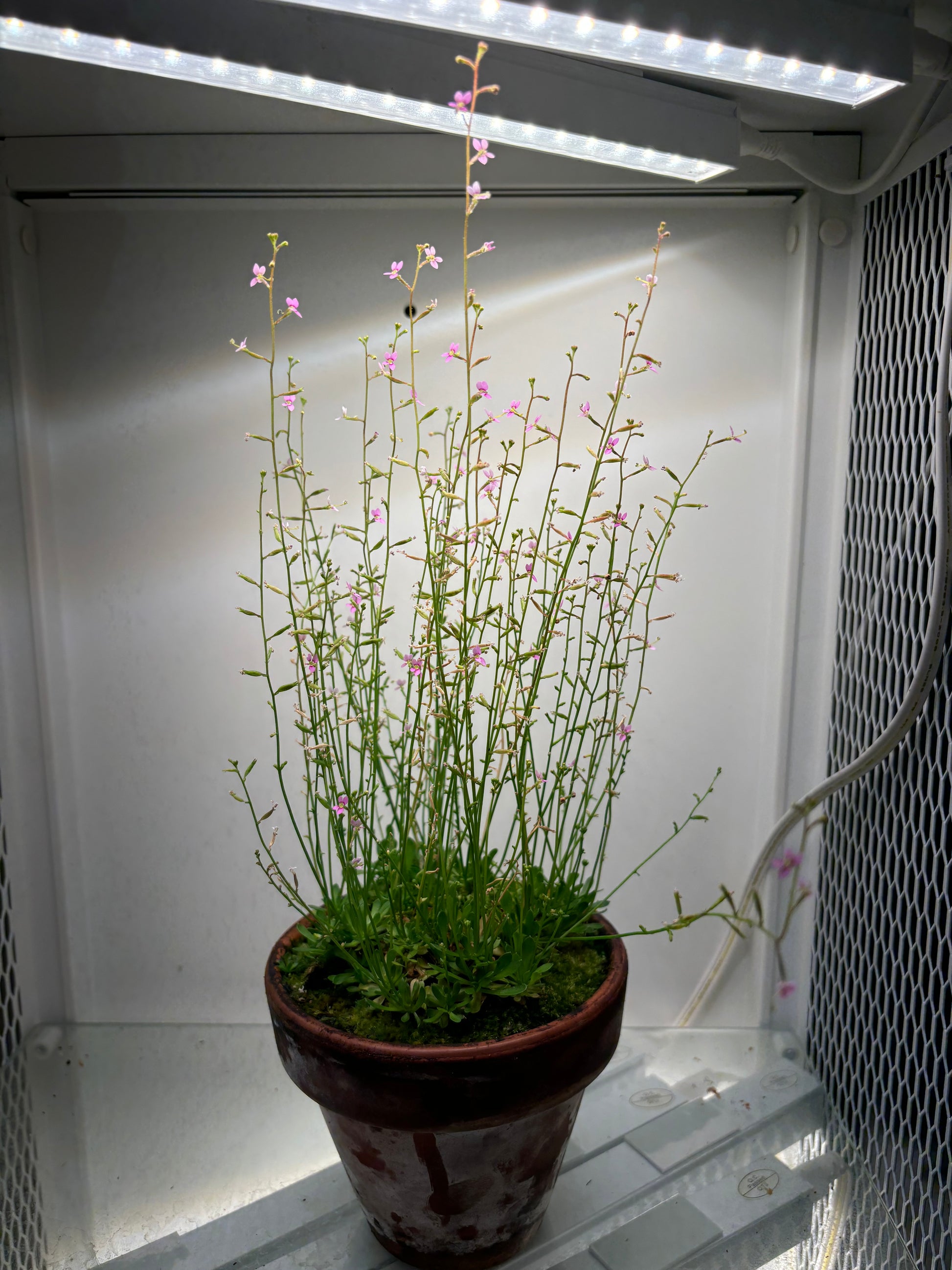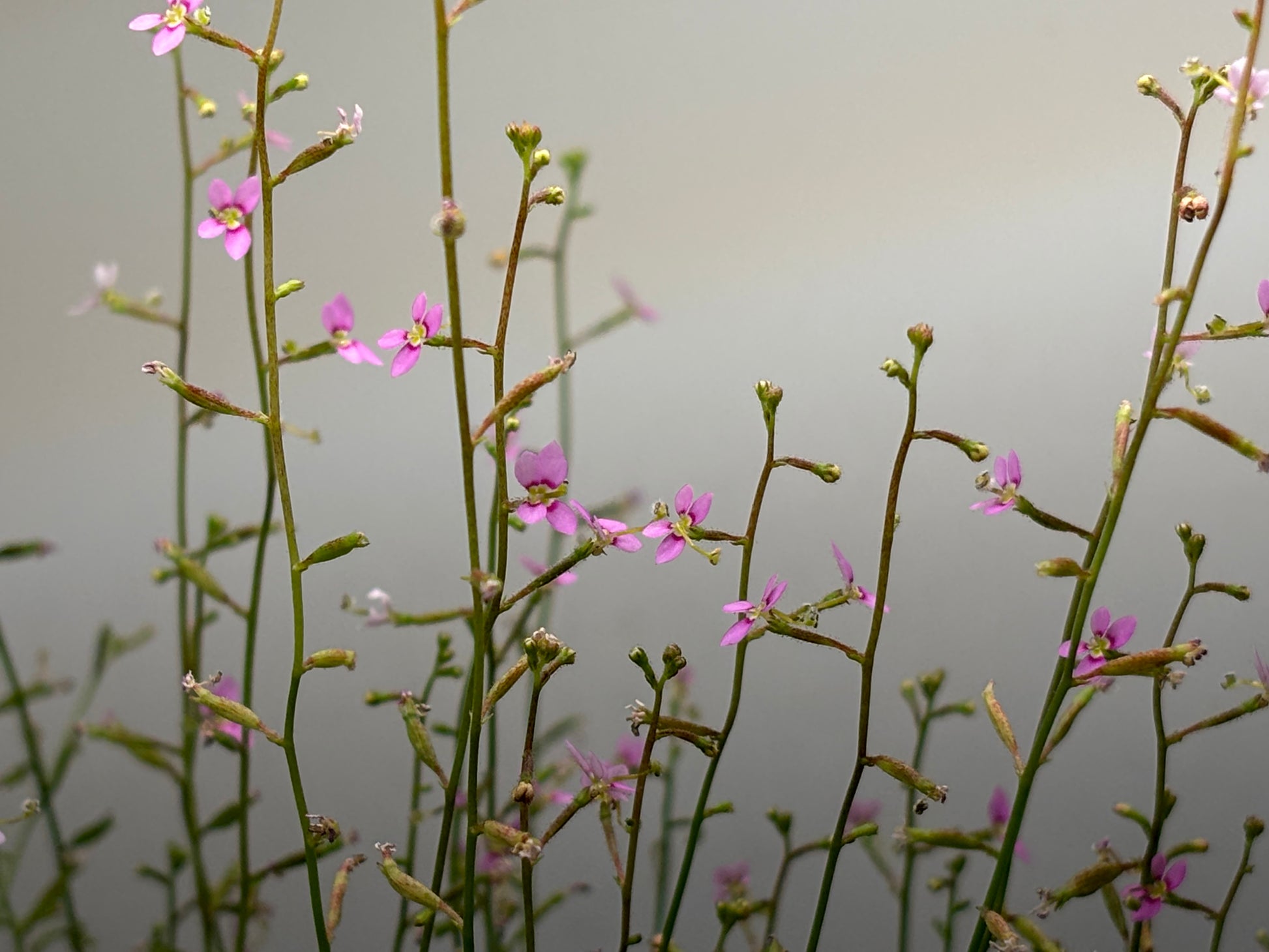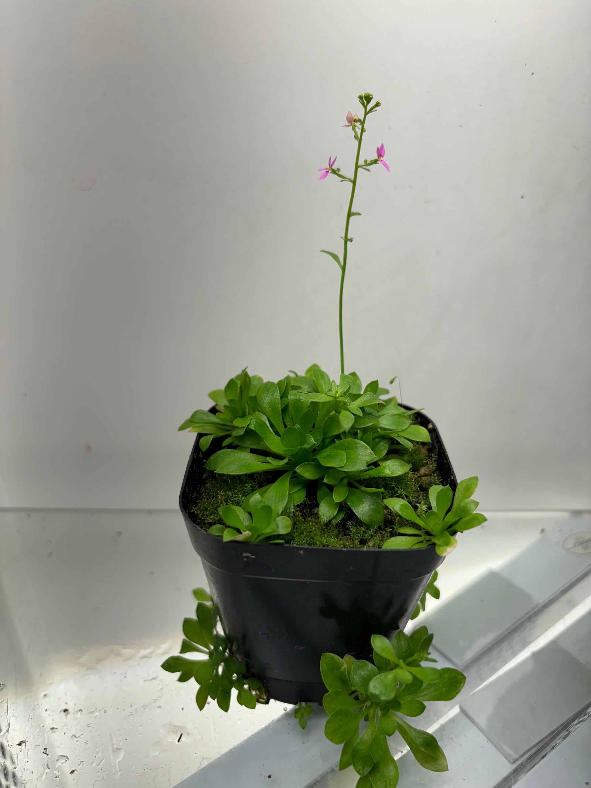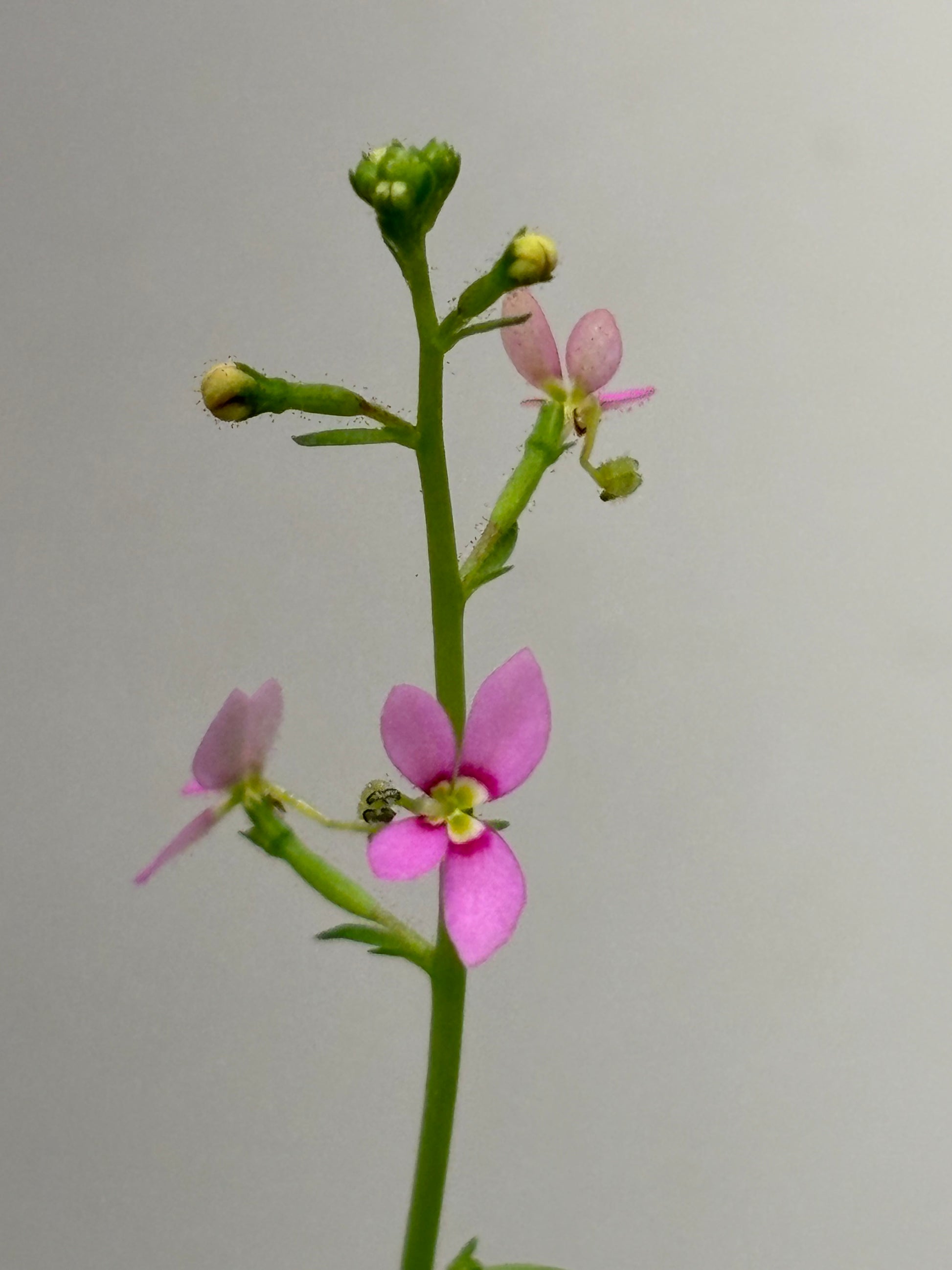 GENERAL INFO: Stylidium is comprised of roughly 300 species. S. debile comes from Australia and is named for is thin yet plentiful flower stalks. This species is very easy to care for, thriving in simple soil mixes and tolerating a wide range of light and water levels. The plant is considered a ‘spreader’ and fills pots quickly. The flowers are covered in sticky trichomes capable of catching and digesting small insects. The name ‘trigger-plant’ refers to the large floral structure which swings forward and hits pollinators as they fuss about for nectar. The trigger does NOT reset. (Like VFT’s, avoid over-stressing for show)